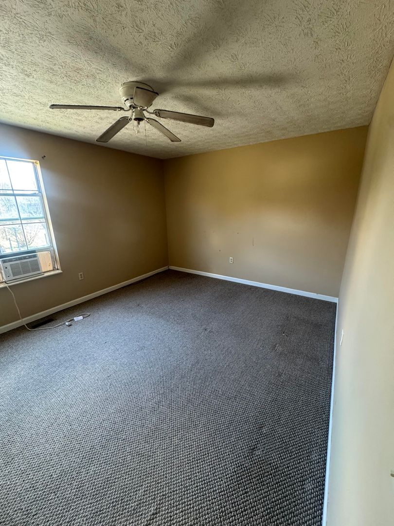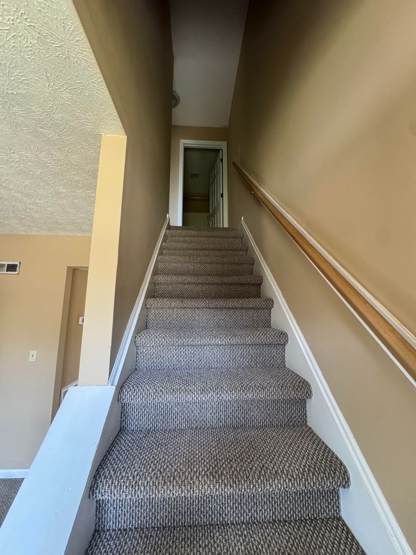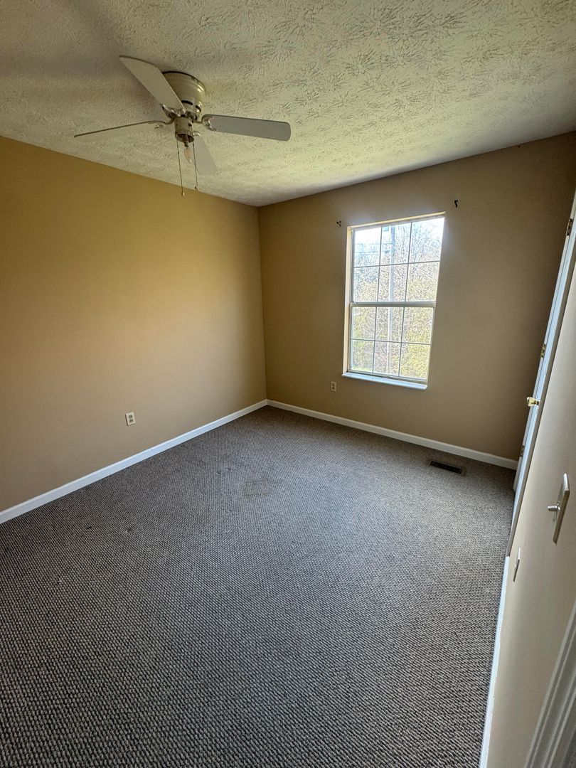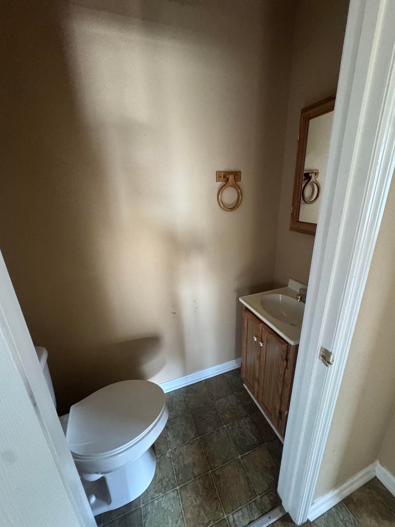 The main level features a large living room, a convenient half bath for guests, and a kitchen equipped with a refrigerator and stove along with plenty of cabinet space. Upstairs you’ll find two well-sized bedrooms and a full bathroom, providing separation between living and sleeping areas.