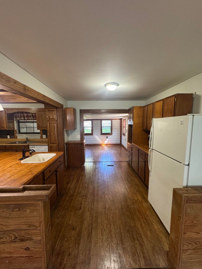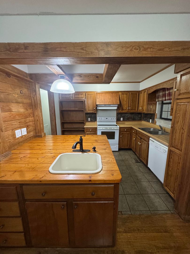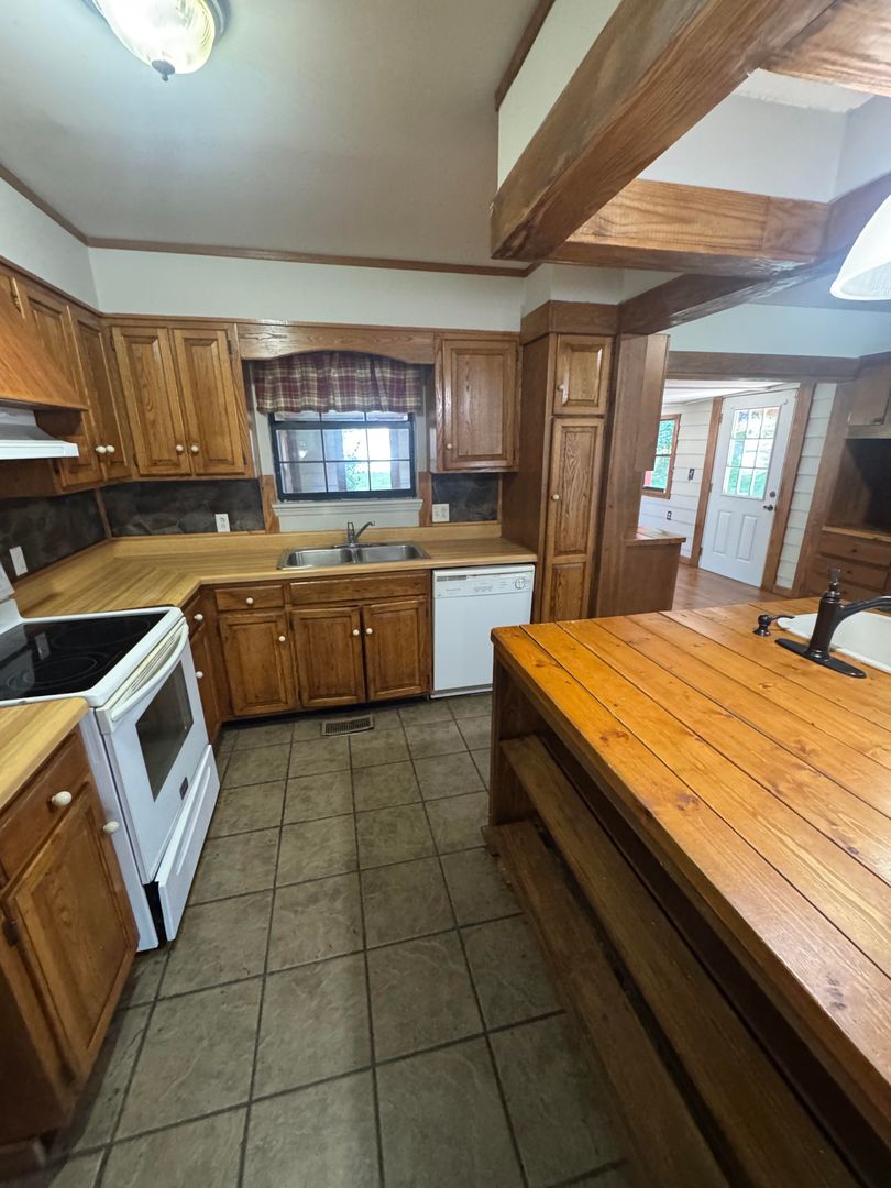 Bright open living/dining with hardwoods flowing into a large, wood-accent kitchen with island, great cabinet storage, and tile flooring.