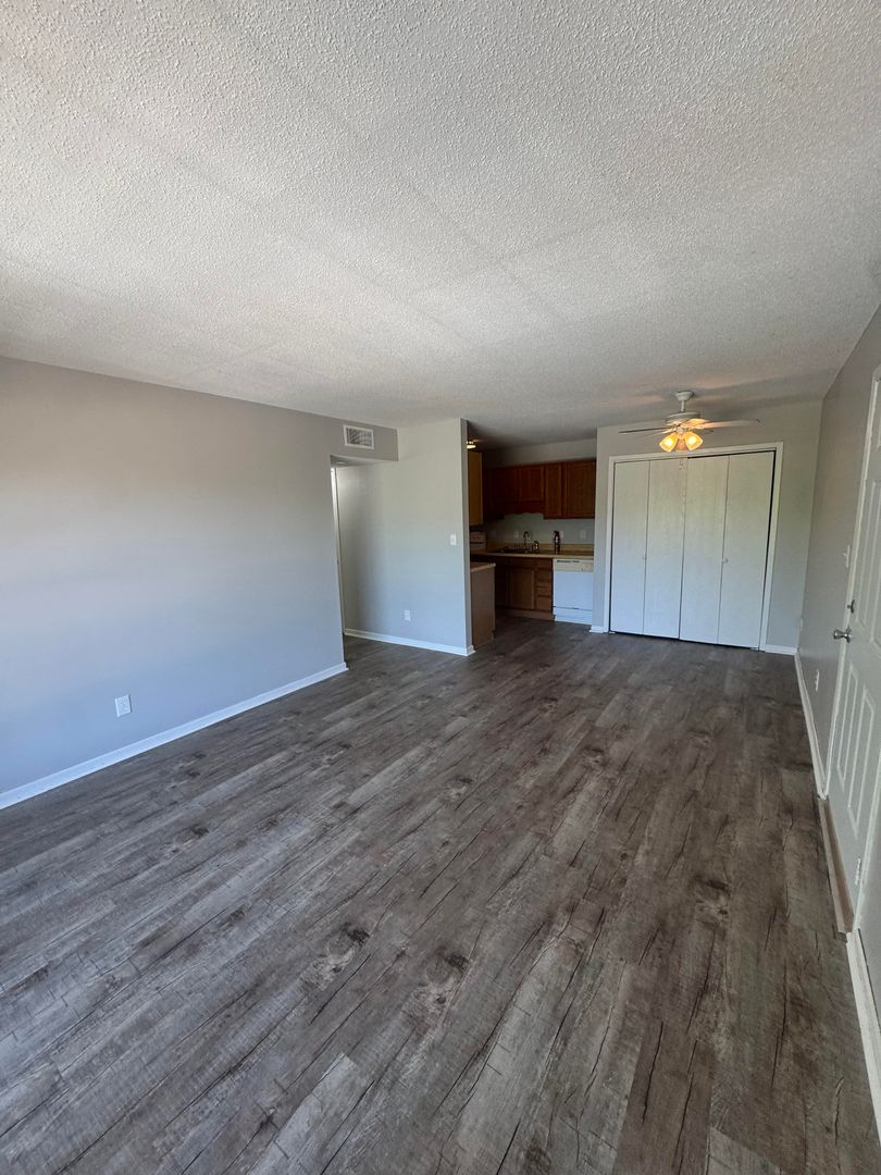 Stylish Living: Revel in a generous living room that boasts fresh grey Luxury Vinyl Tile flooring, offering a modern and chic aesthetic that extends throughout the apartment.