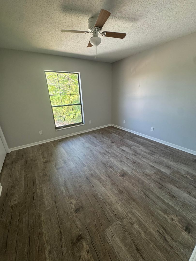 Peaceful Retreat: The bedroom serves as a private haven with plush new flooring, ample closet space, and a soothing view of the neighborhood's lush foliage, enhanced by a cooling ceiling fan.