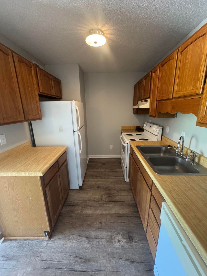 Modern Conveniences: The kitchen is well-appointed with a refrigerator, stove, and dishwasher, all embraced by warm wooden cabinetry and practical design.