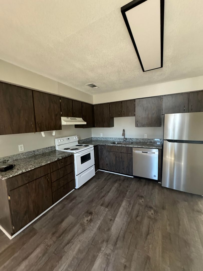 Modern Kitchen: Equipped with granite countertops, refrigerator, stove, and dishwasher.