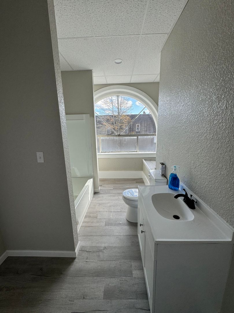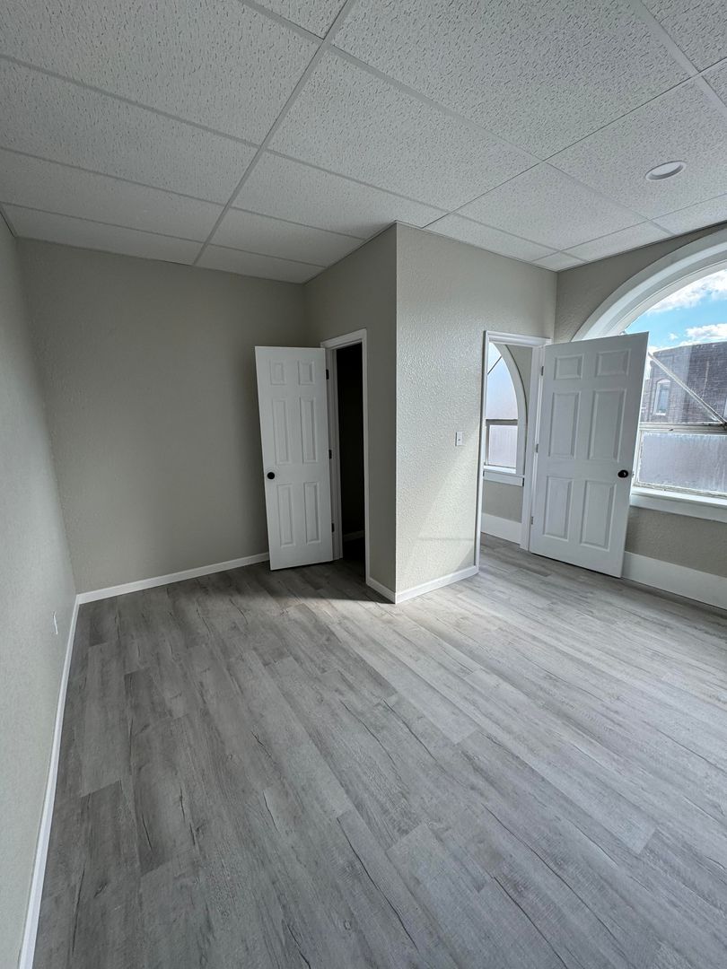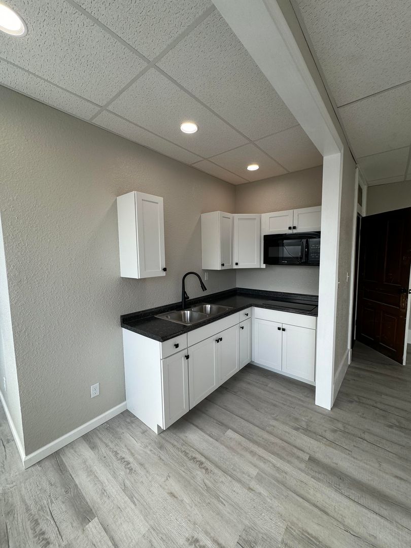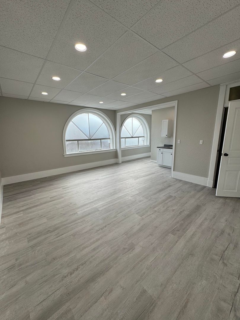The living area, with its large arched windows, offers a picturesque view of the downtown streetscape, setting the stage for relaxation or entertaining guests. The sleek kitchen comes equipped with essential appliances and stylish cabinetry, complemented by dark countertops, making it an enjoyable space for culinary endeavors.