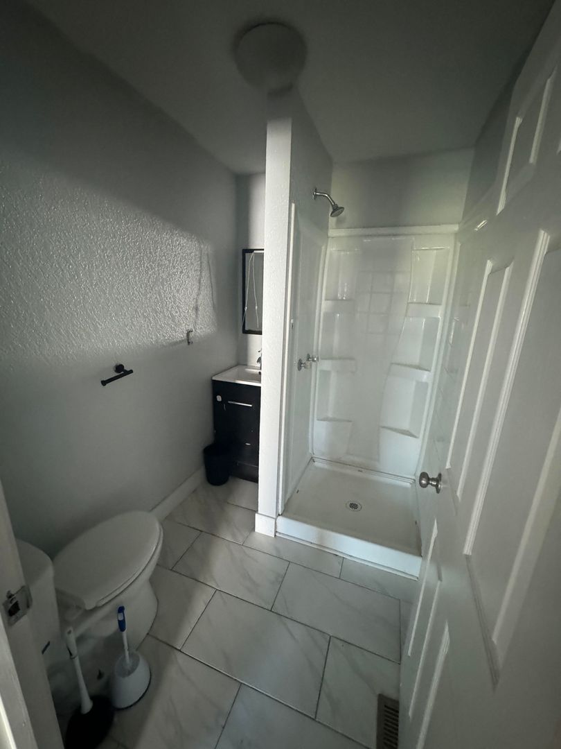 The kitchen is equipped with white cabinetry, a full-sized stove, refrigerator, and ample counter space. The unit also includes washer and dryer hookups for added convenience. Both bathrooms have been refreshed, featuring new fixtures and tile flooring, adding to the apartment's charm.