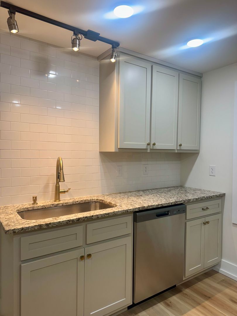 Designer Kitchen: Stainless steel appliances, granite countertops, gold fixtures, subway tile backsplash, and a spacious island – perfect for entertaining.