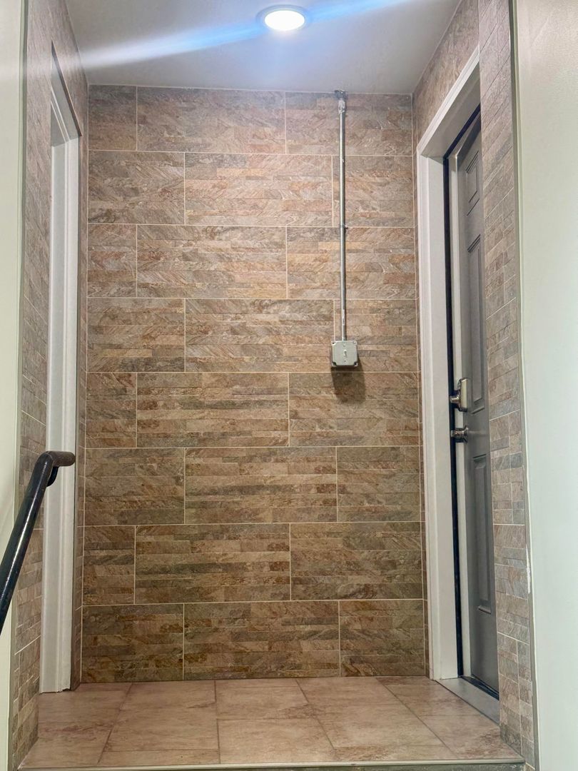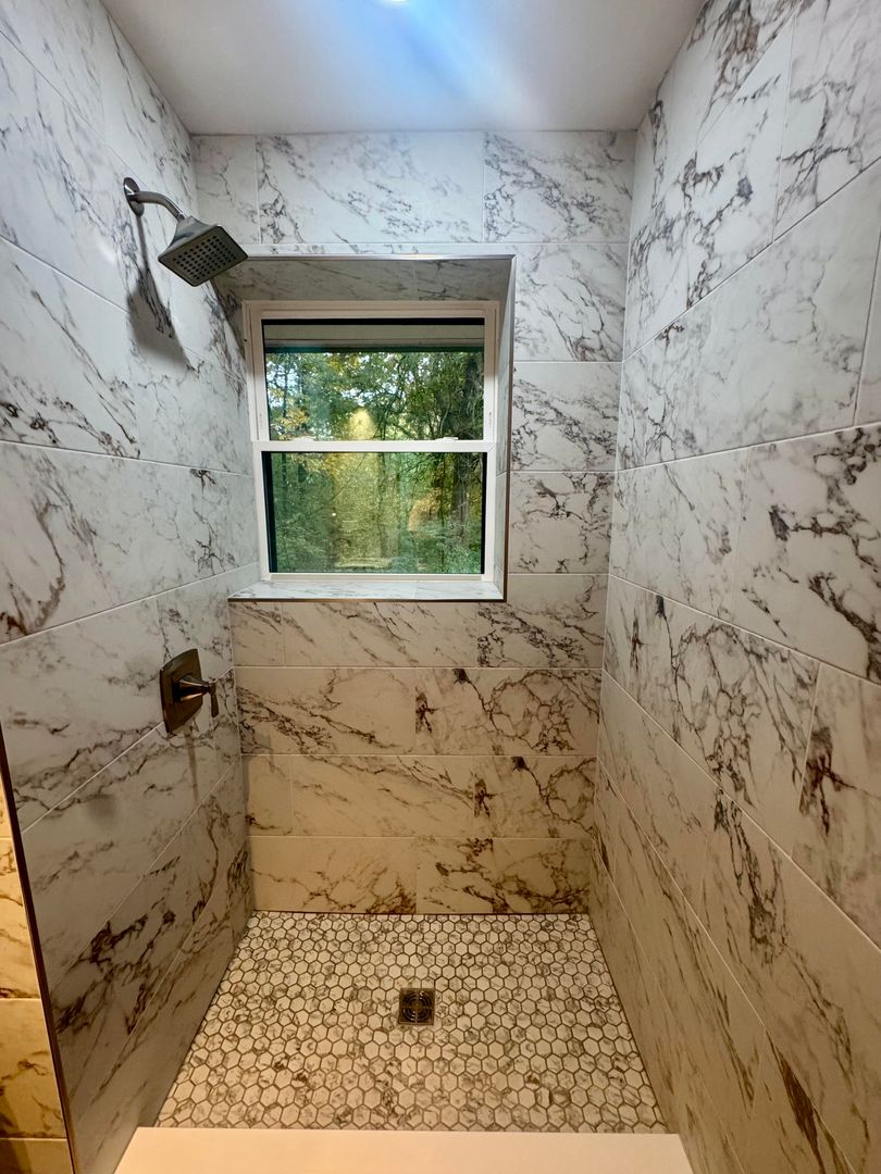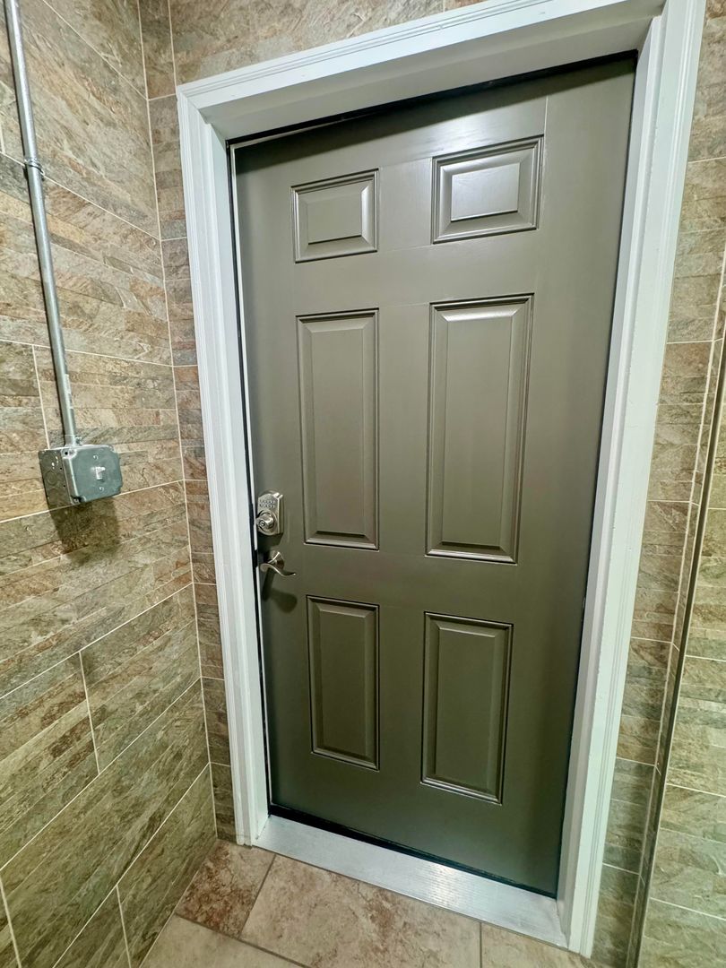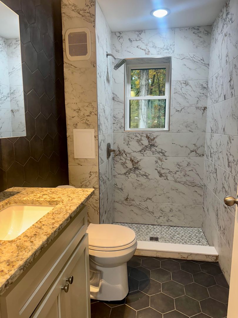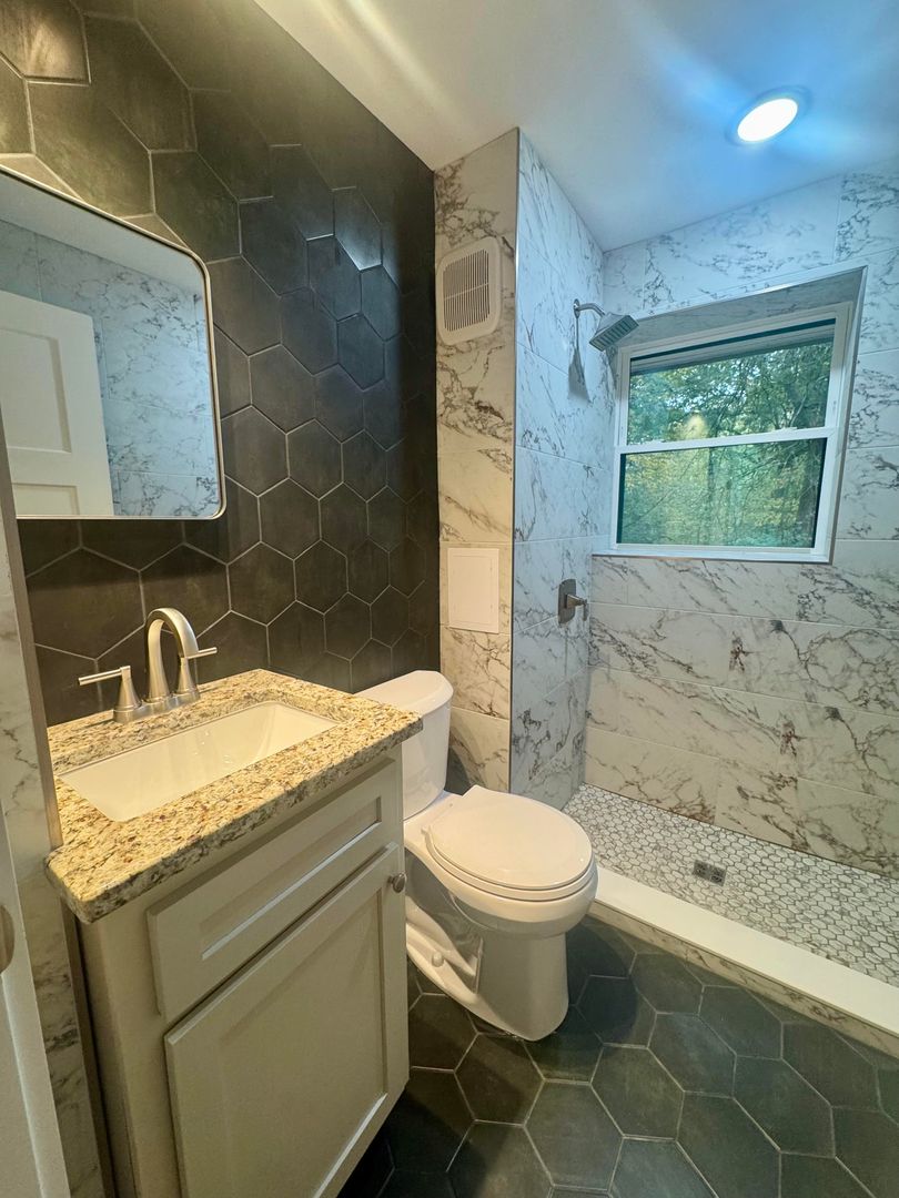 Primary Suite: Large bedroom with generous closet space and a spa-like bathroom featuring tile flooring, bold black accent wall, and a walk-in tile shower.