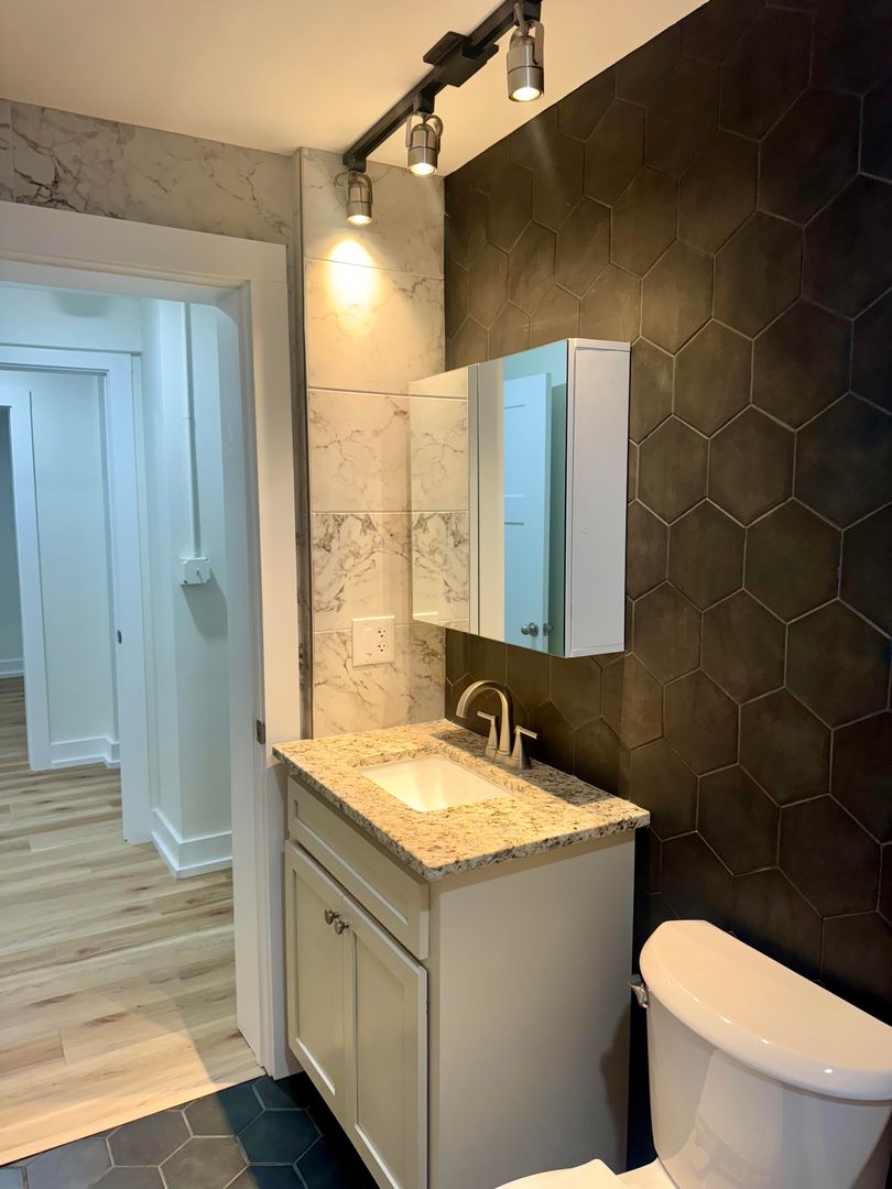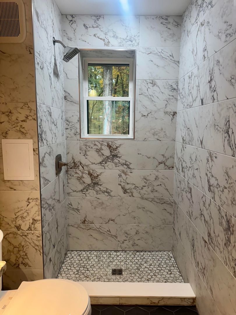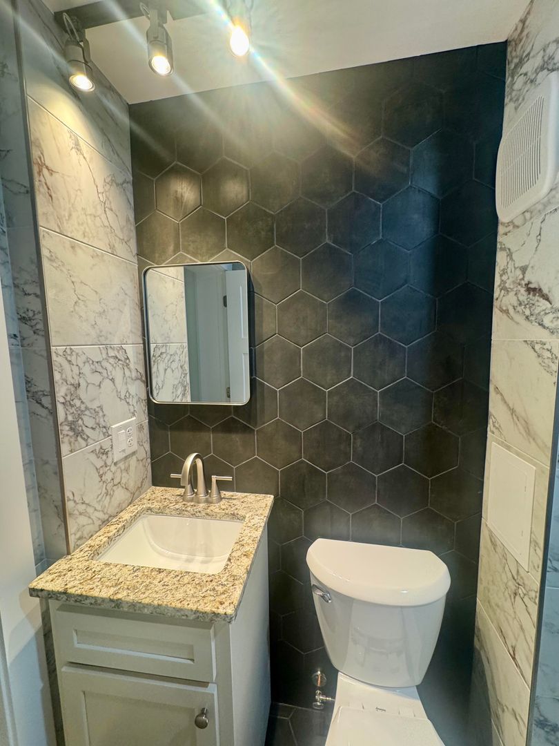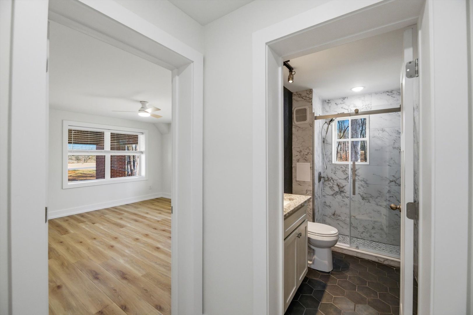 Primary Suite: Large bedroom with generous closet space and a spa-like bathroom featuring tile flooring, bold black accent wall, and a walk-in tile shower.