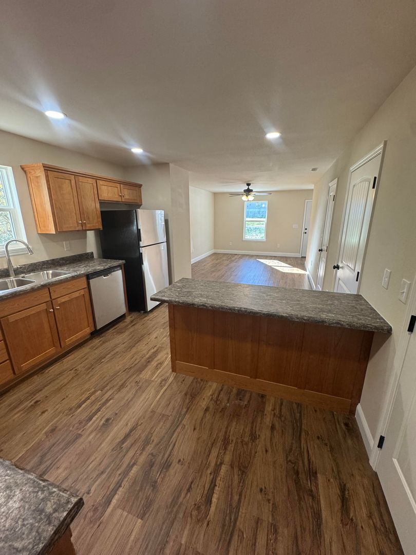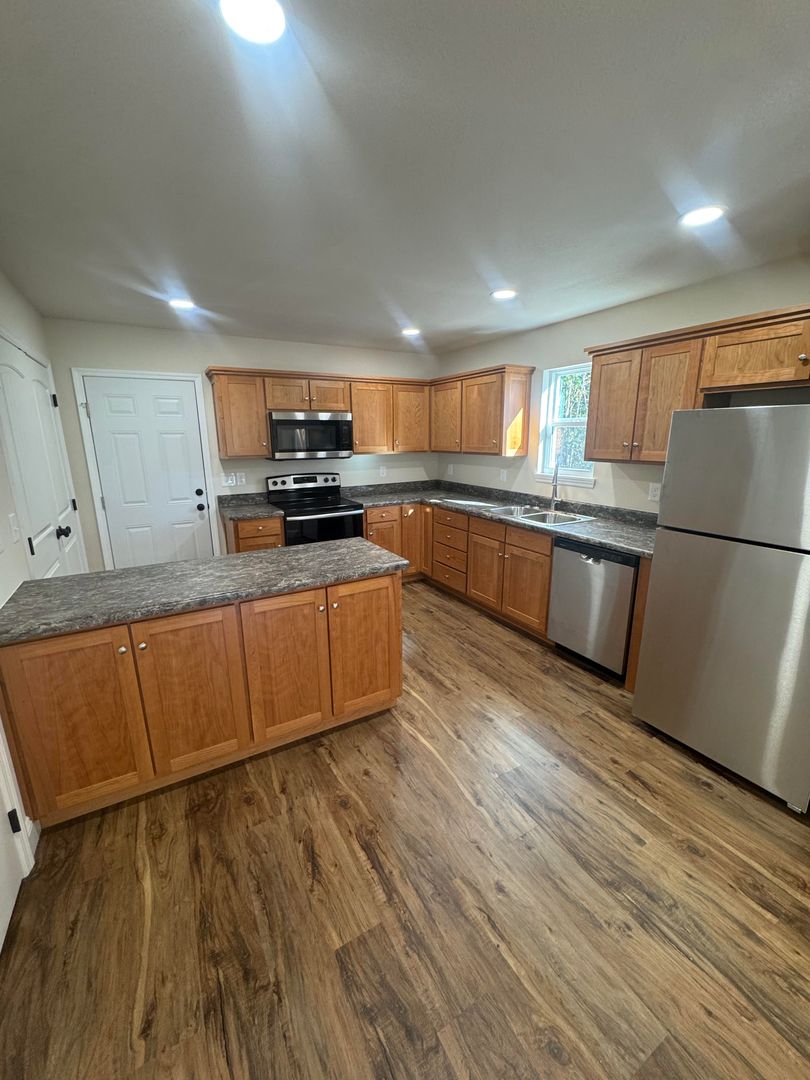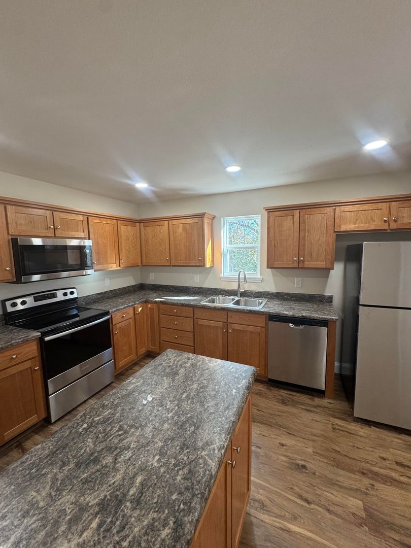 Modern kitchen with island, stainless appliances (fridge, stove, microwave, dishwasher)