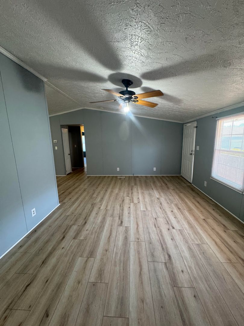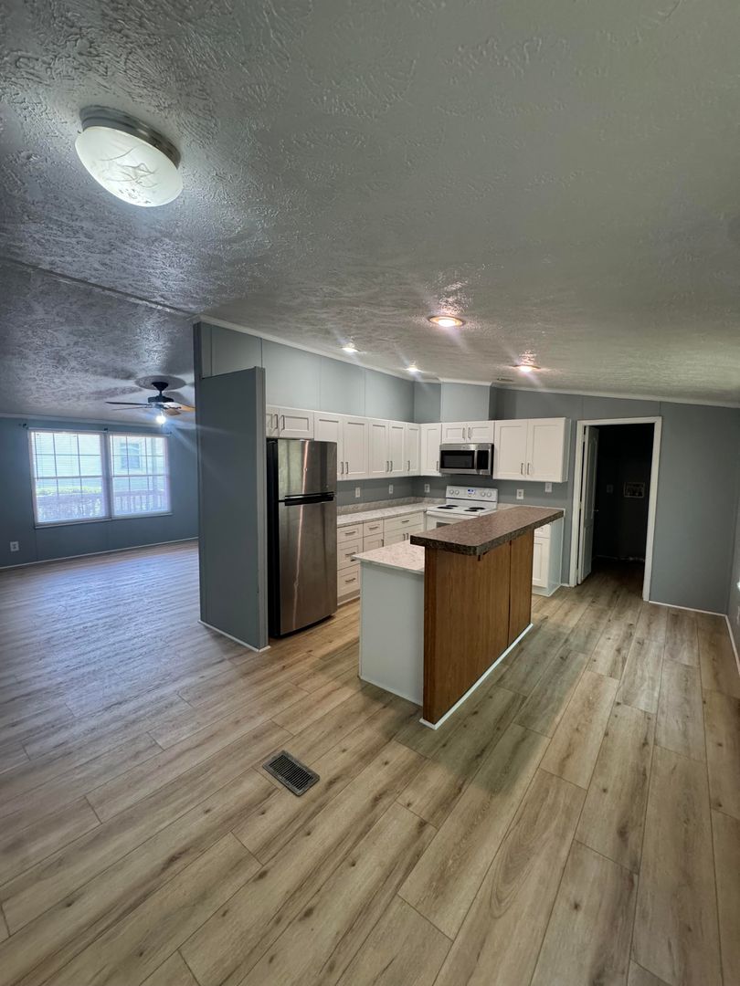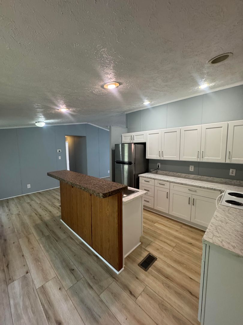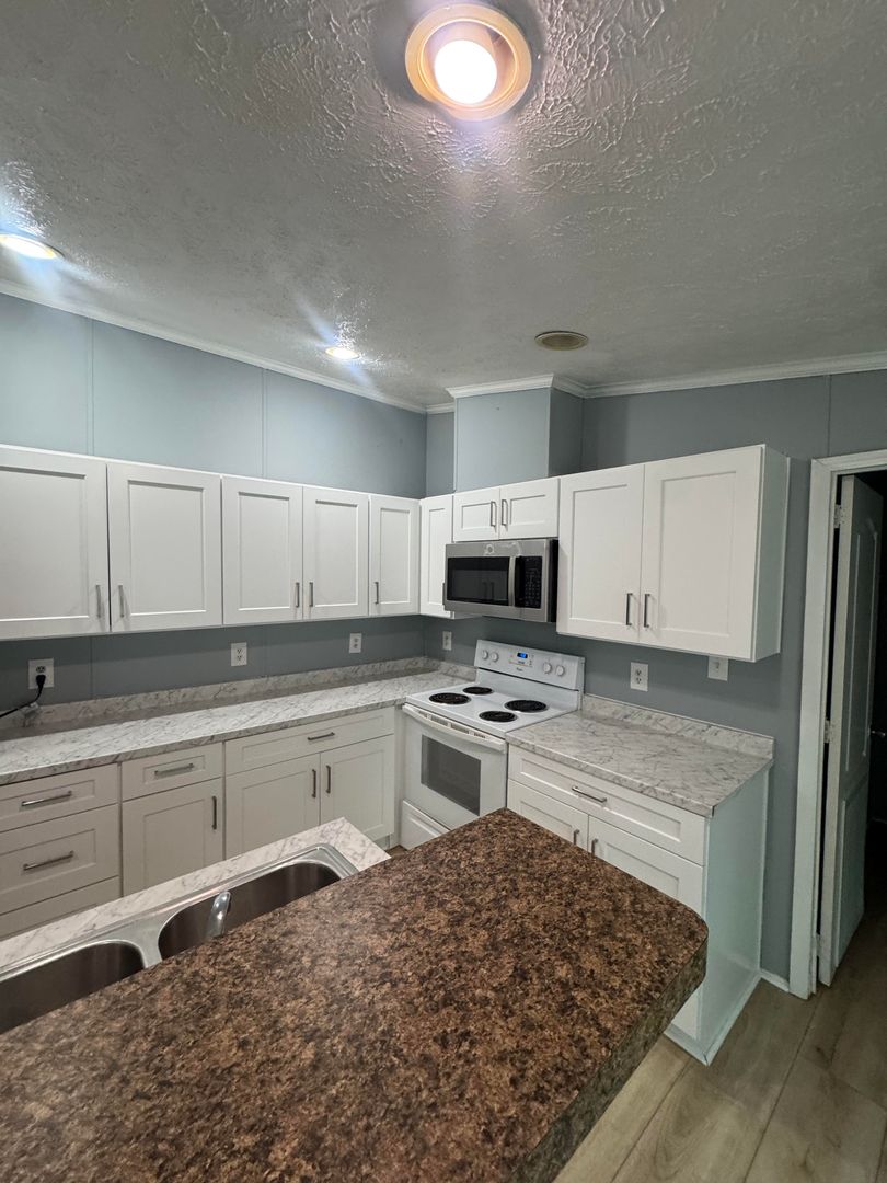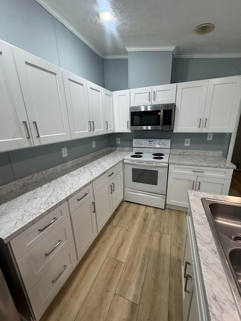 Inside, you’ll find all new LVT flooring and fresh paint throughout, giving the home a clean, modern feel. The open living area flows into a spacious kitchen featuring updated cabinetry, ample counter space, and a full appliance package including refrigerator, stove, dishwasher, and microwave. Washer and dryer hookups are also provided.