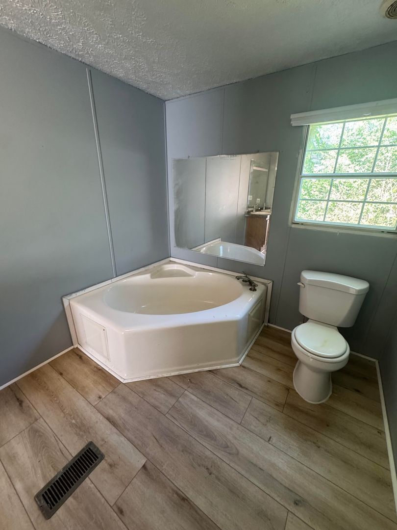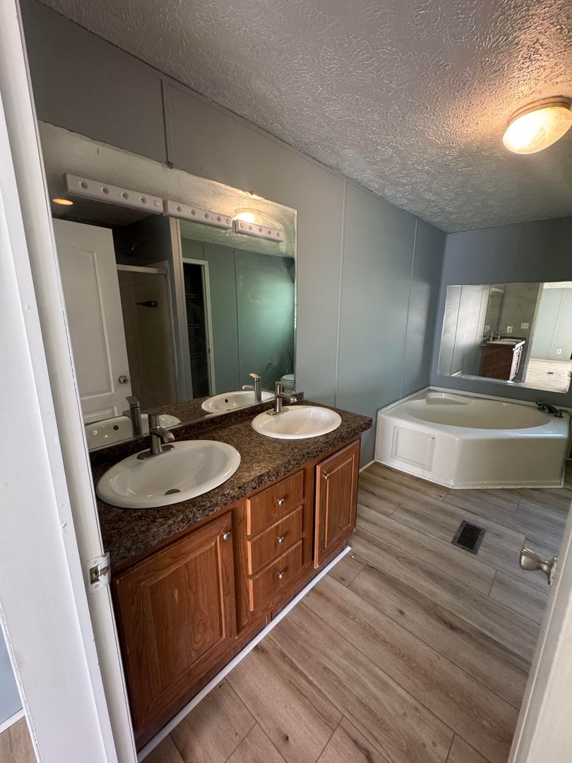 The primary suite is generously sized with a private bathroom that includes double vanities and a large soaking tub, while the additional bedrooms offer good space and natural light.
