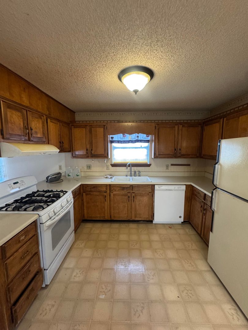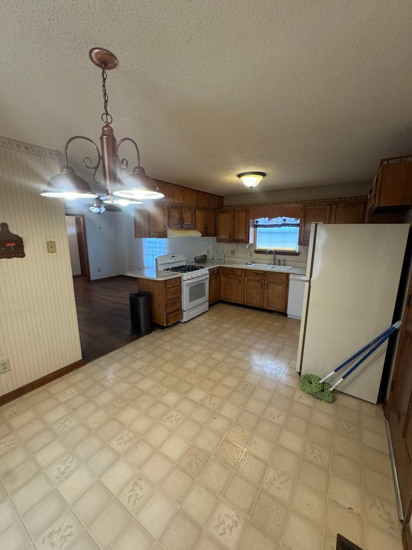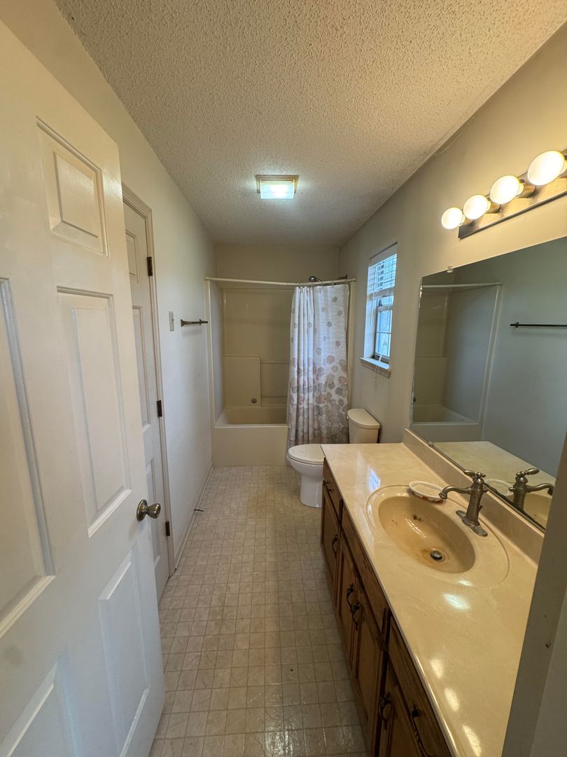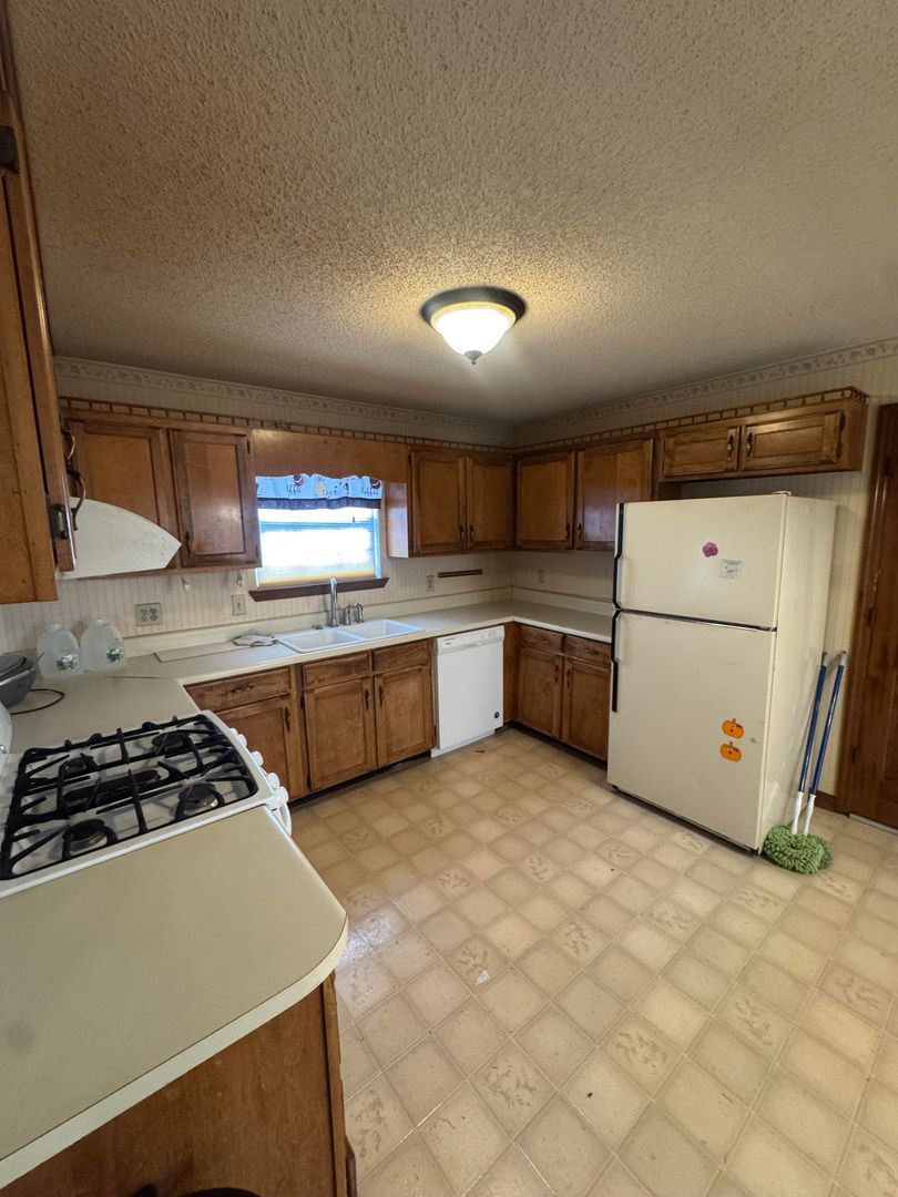 The kitchen offers plenty of cabinet space and comes equipped with a refrigerator, gas stove, and dishwasher. Central heat and air keep the home comfortable year-round.