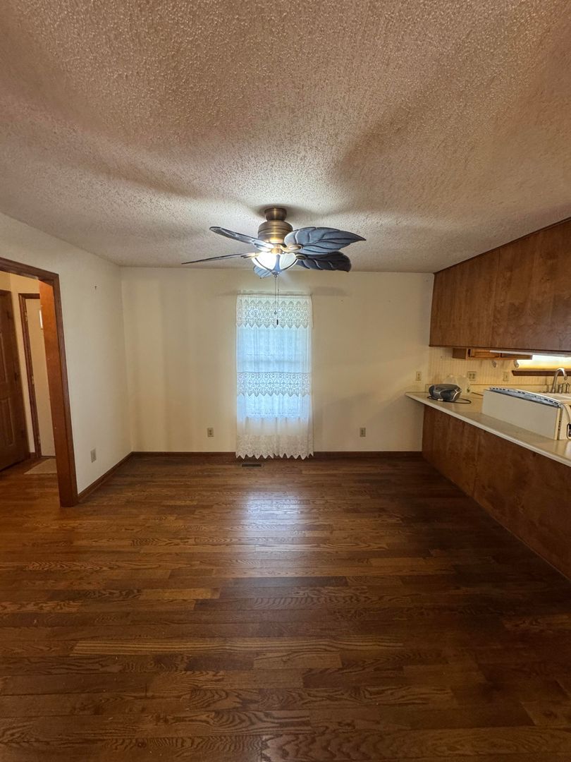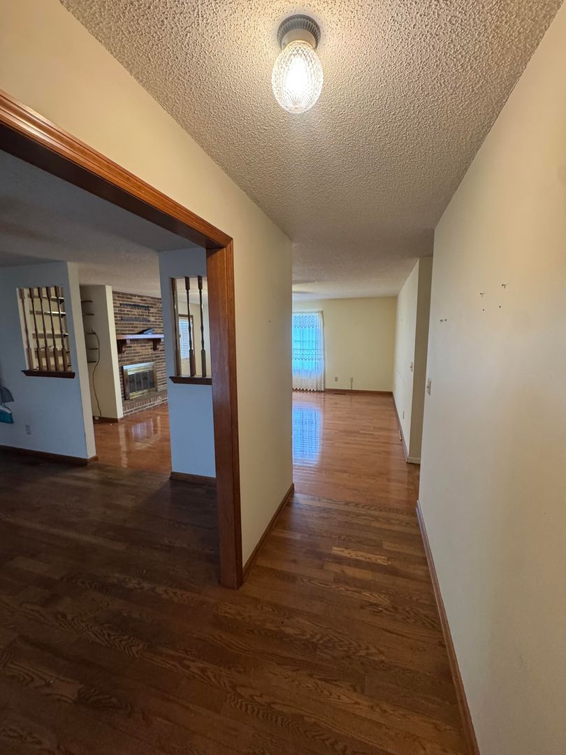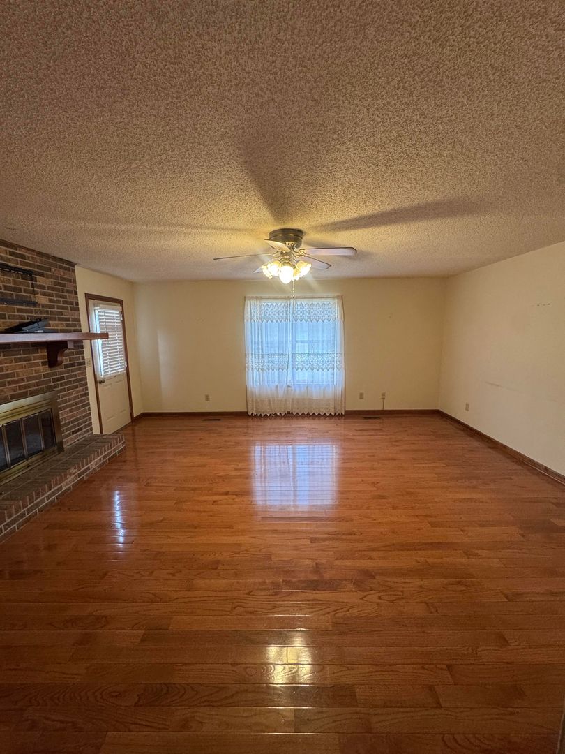Inside, you’ll find beautiful hardwood floors throughout much of the home and a large living area featuring a brick fireplace and built-in shelving. The layout provides both functionality and character without feeling outdated.